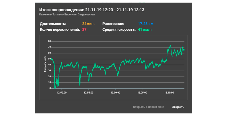 • Формирование отчёта в графическом виде по результату сопровождения с параметрами: скорость, время, длина маршрута